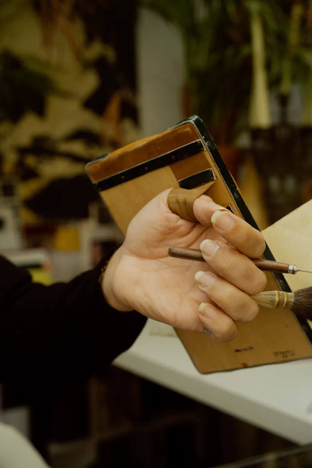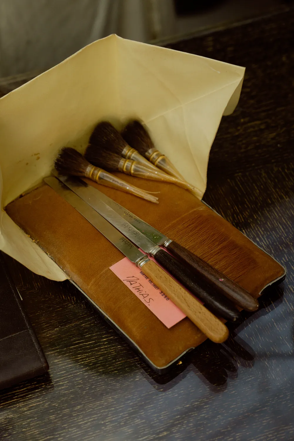 « Quand je suis entré chez les Compagnons, j’avais très peu d’expérience, et ils m’ont tout appris sur le tas, notamment la dorure. Ce coussin à dorer sert à manipuler les feuilles d’or. J’aime beaucoup son côté médiéval : avec la petite encoche pour mettre le pouce, on s’attend presque à voir un aigle venir se poser dessus ! On pose les feuilles dessus pour pouvoir les étaler et les découper sans les froisser tout en les protégeant du vent grâce au parchemin, et pour la gestuelle, tout se joue avec la respiration : il faut apprendre à la synchroniser avec son mouvement pour que le geste soit rapide et que la feuille ne s’envole pas.